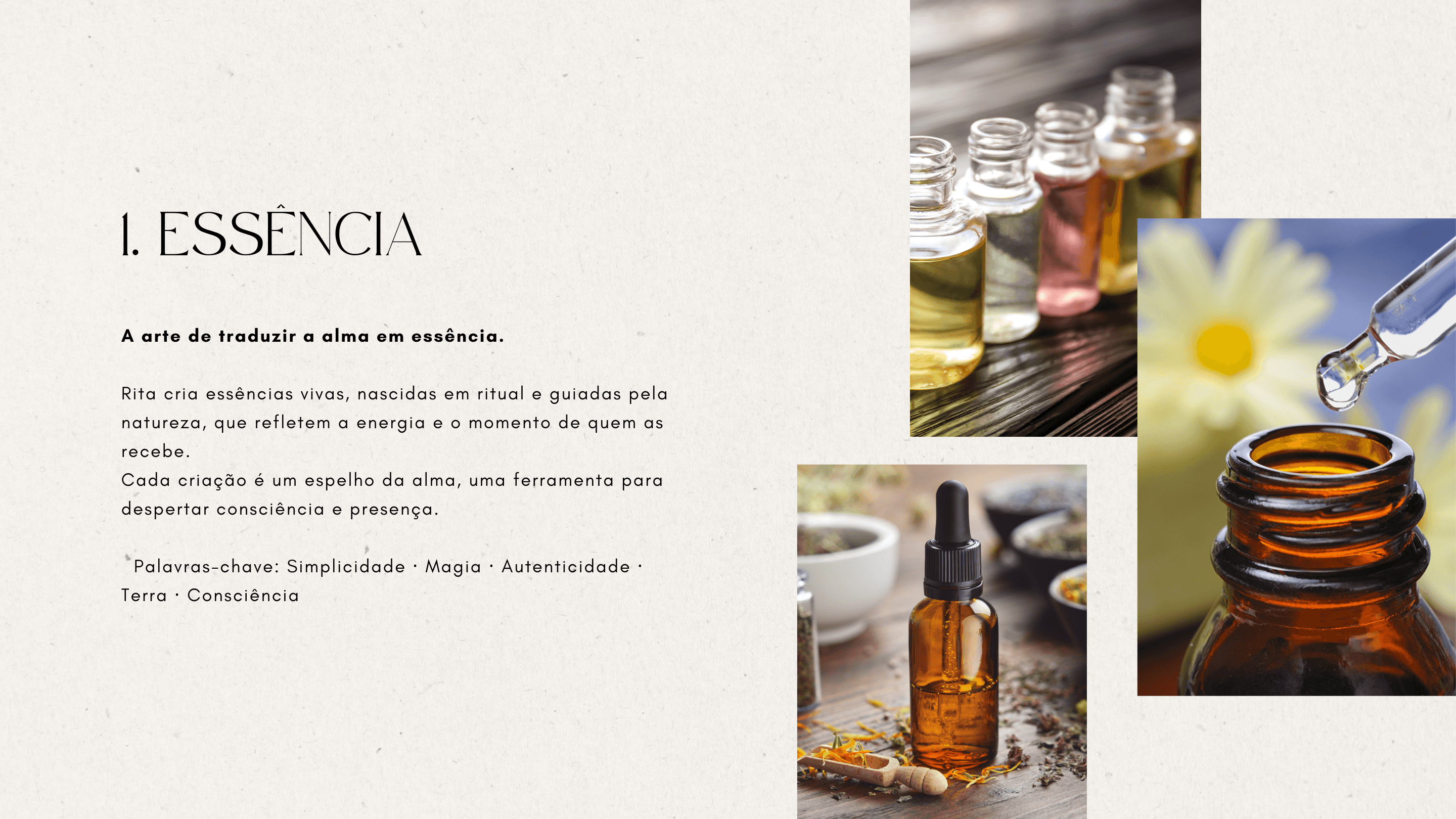 A personal branding journey. Rita Pinho creates living essences, born through ritual and guided by nature, reflecting the energy and moment of the person who receives them.